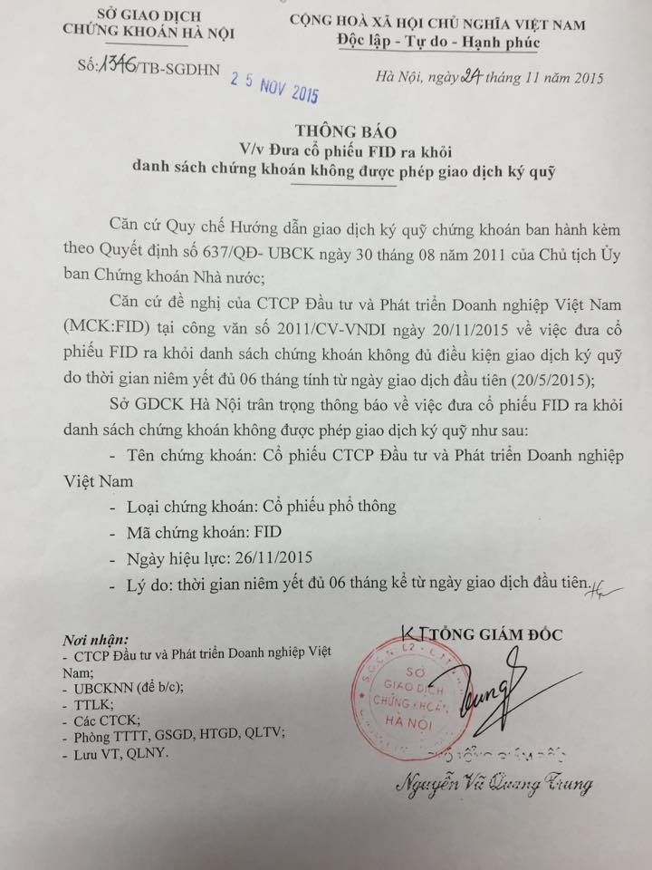 FID ĐƯỢC CHẤP THUẬN GIAO DỊCH CỔ PHIẾU KÝ QUỸ TỪ NGÀY 26/11/2015